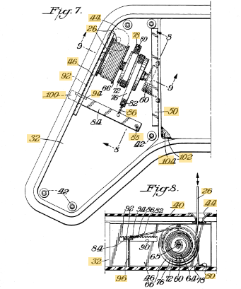 张力调节机构的细节。如图7-8所示,轴56在一端安装到支架46以在合适的衬套58中旋转。轴56的内端通过安装到内支架50而固定到内支架50。弹簧座 60 又通过铆钉 62 或任何其他合适的紧固件固定到支架 50。动力弹簧64安装在弹簧座60内。弹簧64的端部插入轴56的弹簧固定槽65中,从而使轴56沿返回方向旋转,以将绳索26拉回到外壳32中。